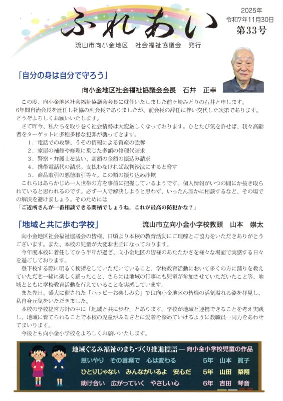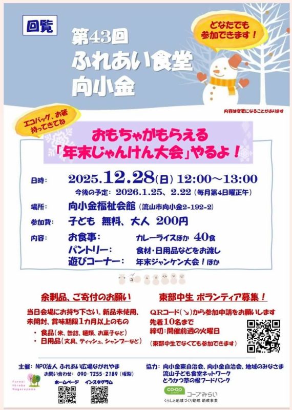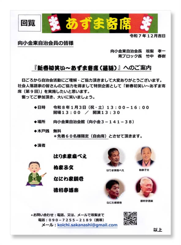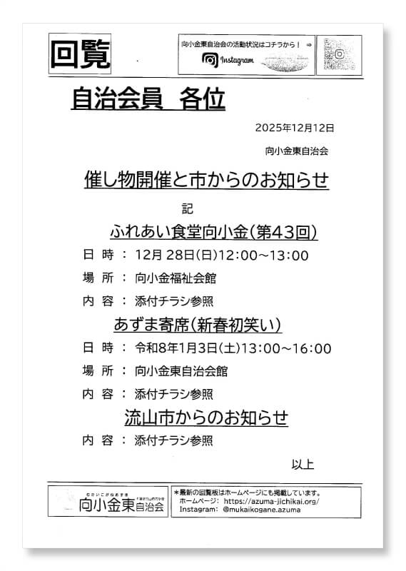 催しもののお知らせ、市からの通知ほか 2025.12.18 12月12日の回覧は、催しもののお知らせ、流山市からの通知、地区社会福祉協議会からのお知らせです。 詳細は下記のチラシでご確認ください。画像タップで拡大表示します。 ■ ご案内文 ■ 催しもののお知らせ: ふれあい食堂向小金 ■ 催しもののお知らせ: あずま寄席 向小金東自治会主催の新春初笑い寄席(落語)です。ぜひご参加ください。 ■ 流山市からの通知 ■ 地区社会福祉協議会「ふれあい」