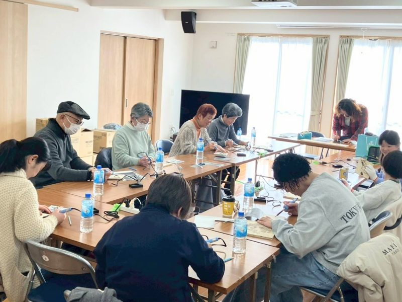 今回は大人も参加OKです。10人ほどの参加者が集まりました。子どもも大人も一緒になって、来年の干支の「午(うま)」を焼き絵で描くワークショップです。