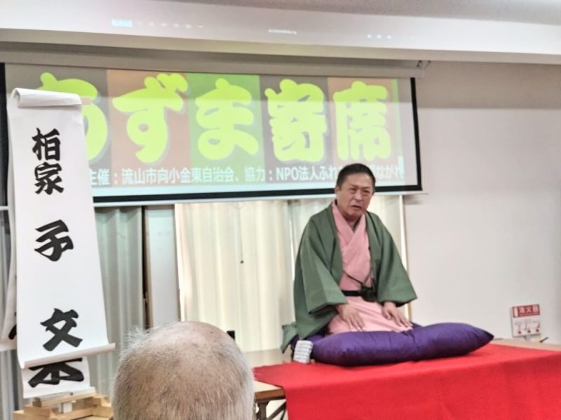 そして今回初めてあずま寄席に来てくださったのが、柏家子文さん。演目は、屏風に書いた雀が飛んで出てくる「抜け雀」。言葉遊びと親孝行をテーマにした人情噺でした。じっくり聞かせてもらいました。