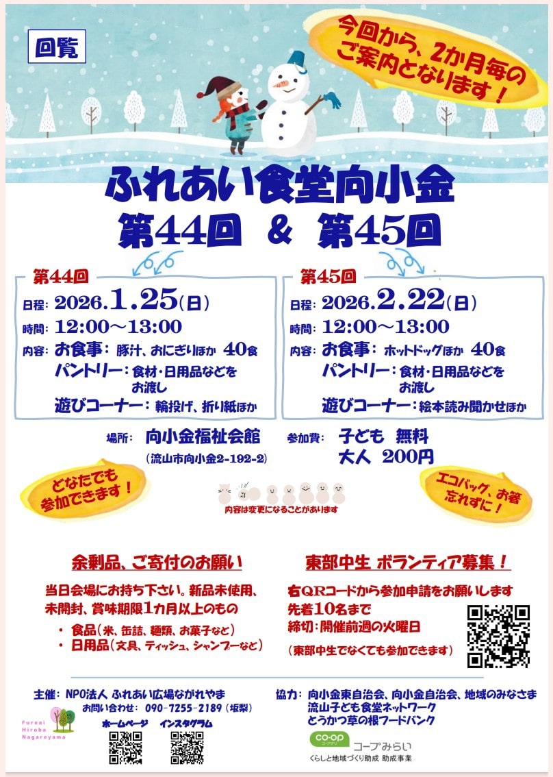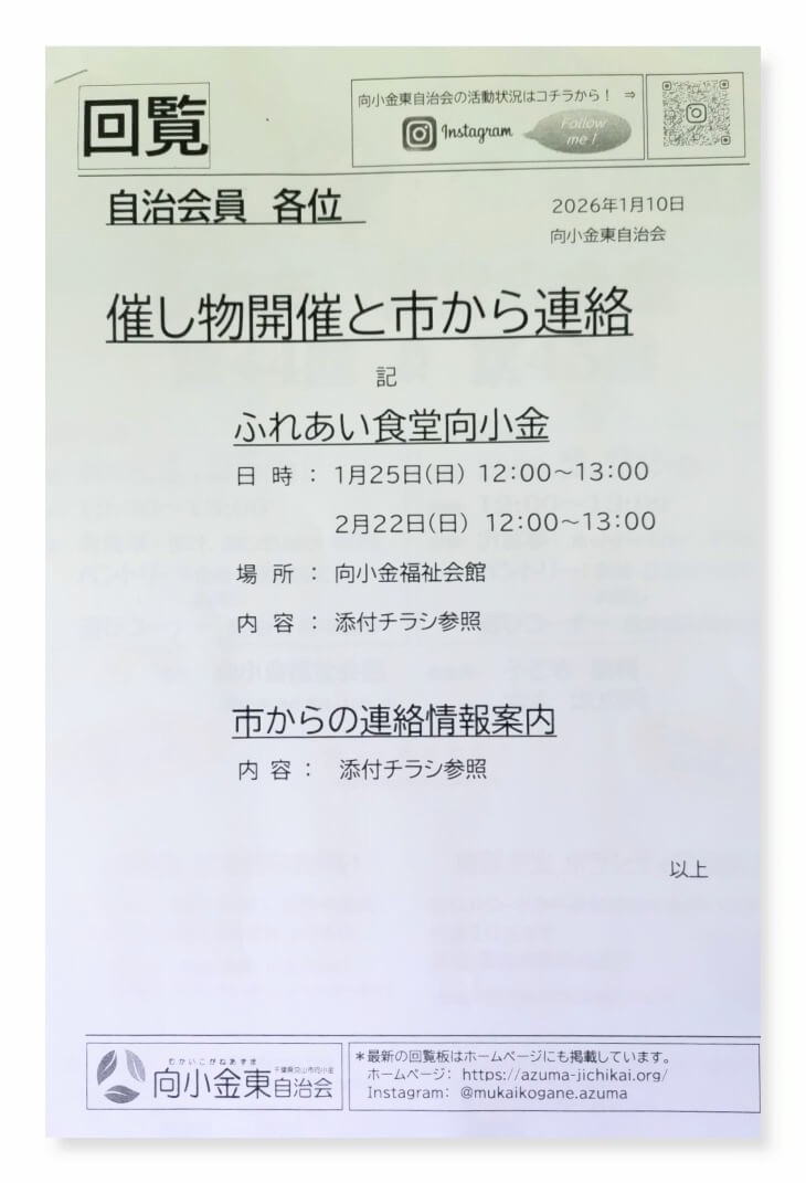 催しもののお知らせ、流山市からのお知らせ 2026.01.12 1月10日の回覧は、催しもののお知らせと流山市からのお知らせです。下記からご確認ください。 画像タップで拡大表示します。 ■ お知らせ文 ■ 催しもの:ふれあい食堂向小金 ■ 流山市からのお知らせ ◉ 犯罪発生情報 ◉ 流山市消費生活センターからの大切なお知らせ