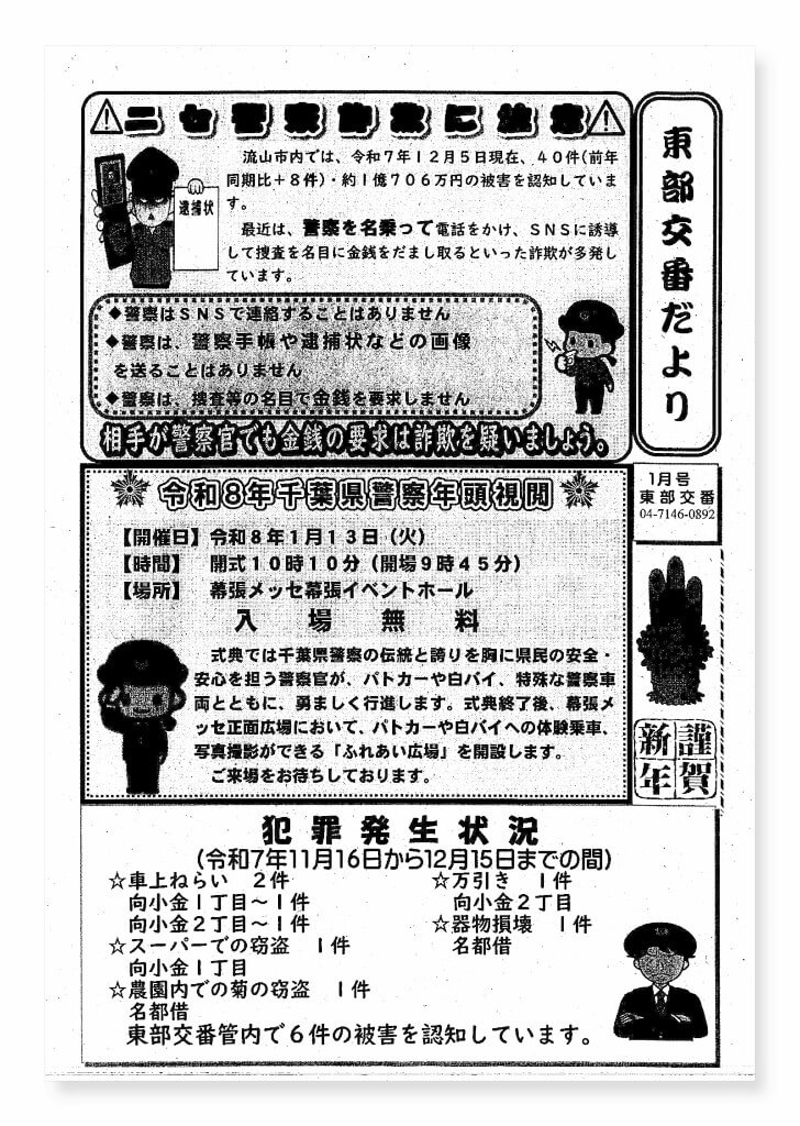 2月8日の回覧は、流山市からのお知らせ、東部交番だよりなどです。