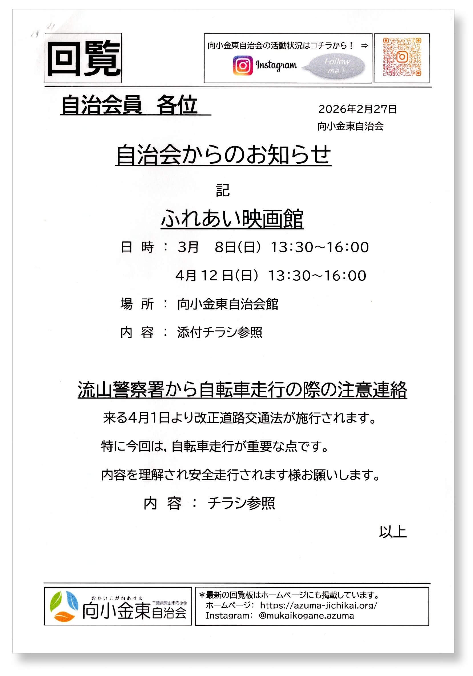 2月27日の回覧板は、「催しもののお知らせ」と「千葉県警察・千葉県からの改正道路交通法についてのお知ら」せです。