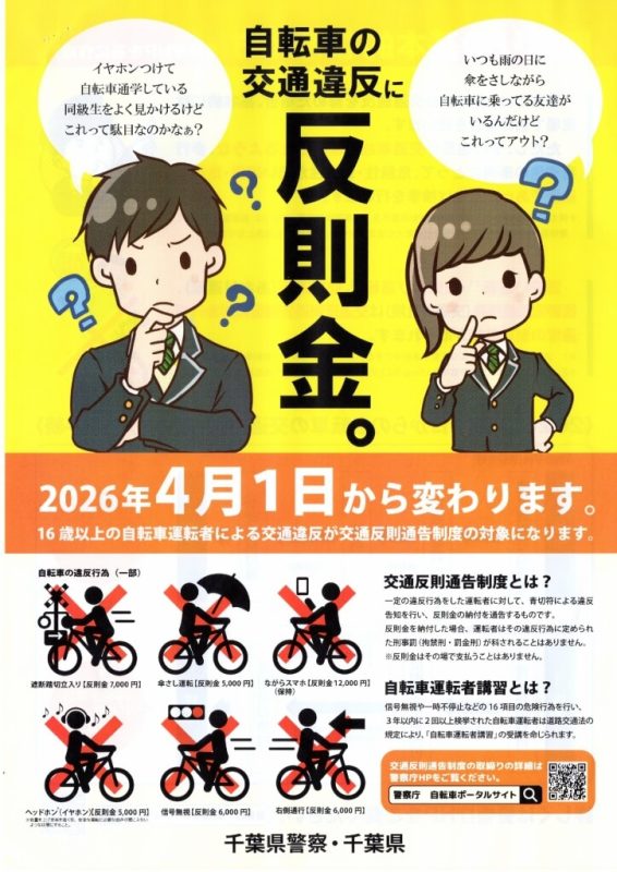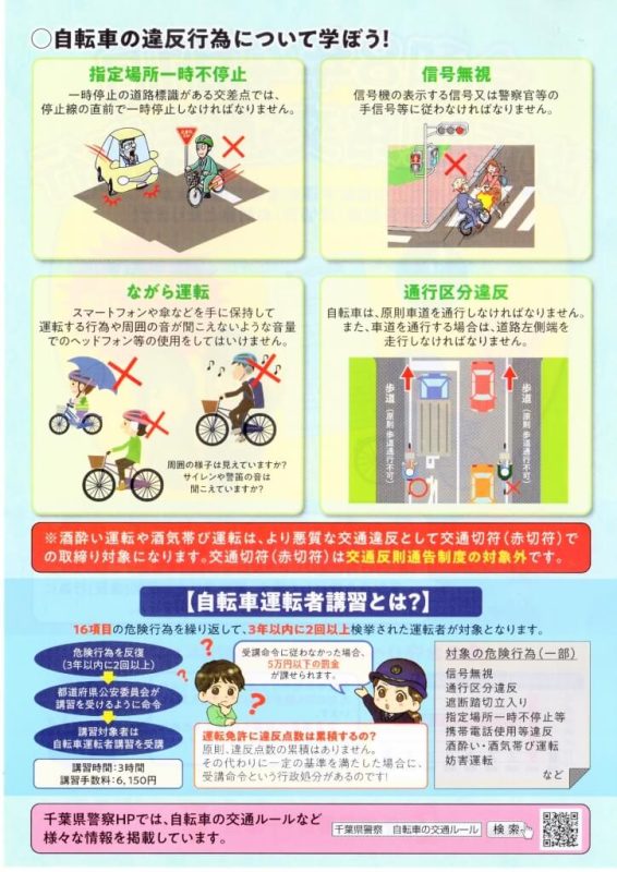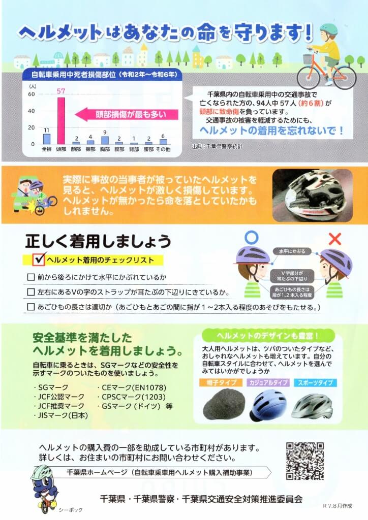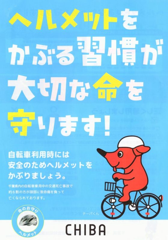 チラシにもありますように、命を守るために、ヘルメットをかぶるようにしましょう。また自転車でも交通違反すると反則金が課されます。しっかりルールを守るようにしましょう。